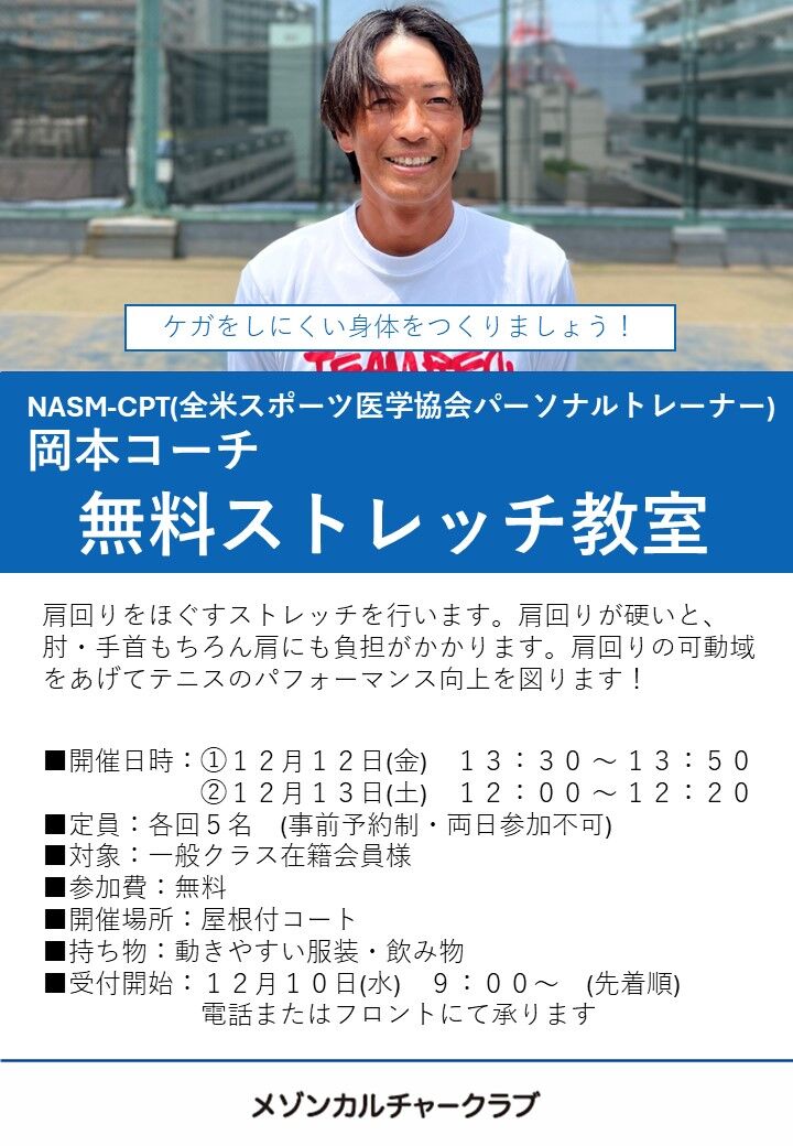 岡本テニス、ストレッチ塾は1月2日(金)15:00~と3日(土)16:30~となっております。是非ご参加ください。宜しくお願い致します!