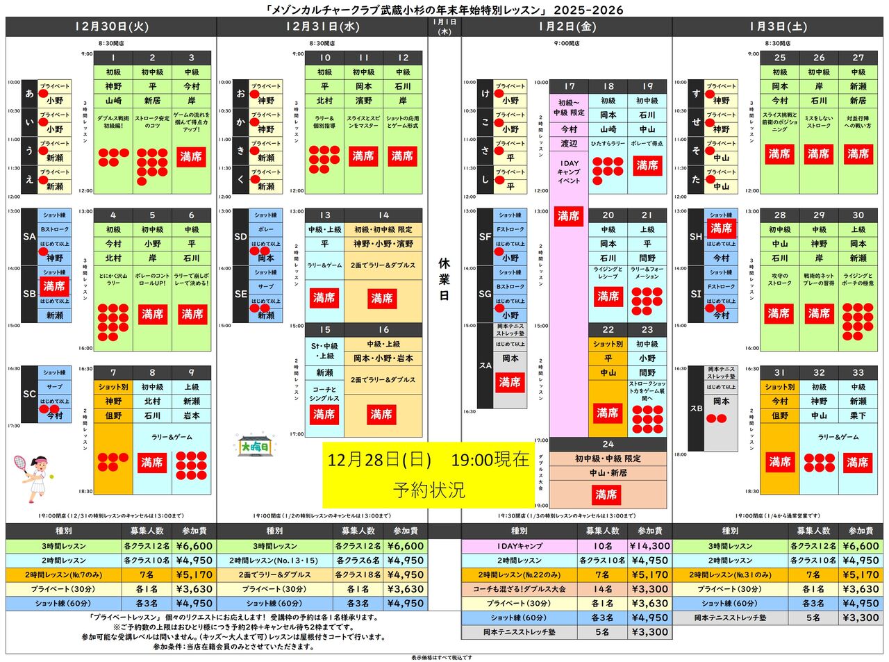年末年始イベント空き状況です。