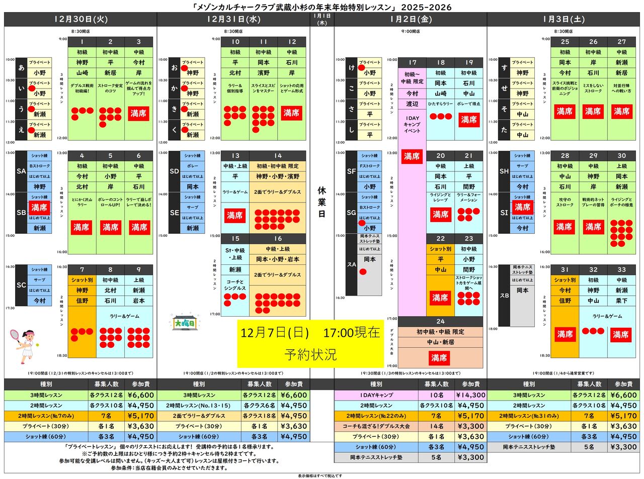 12月7日(日)17:00現在の予約状況をお知らせします。