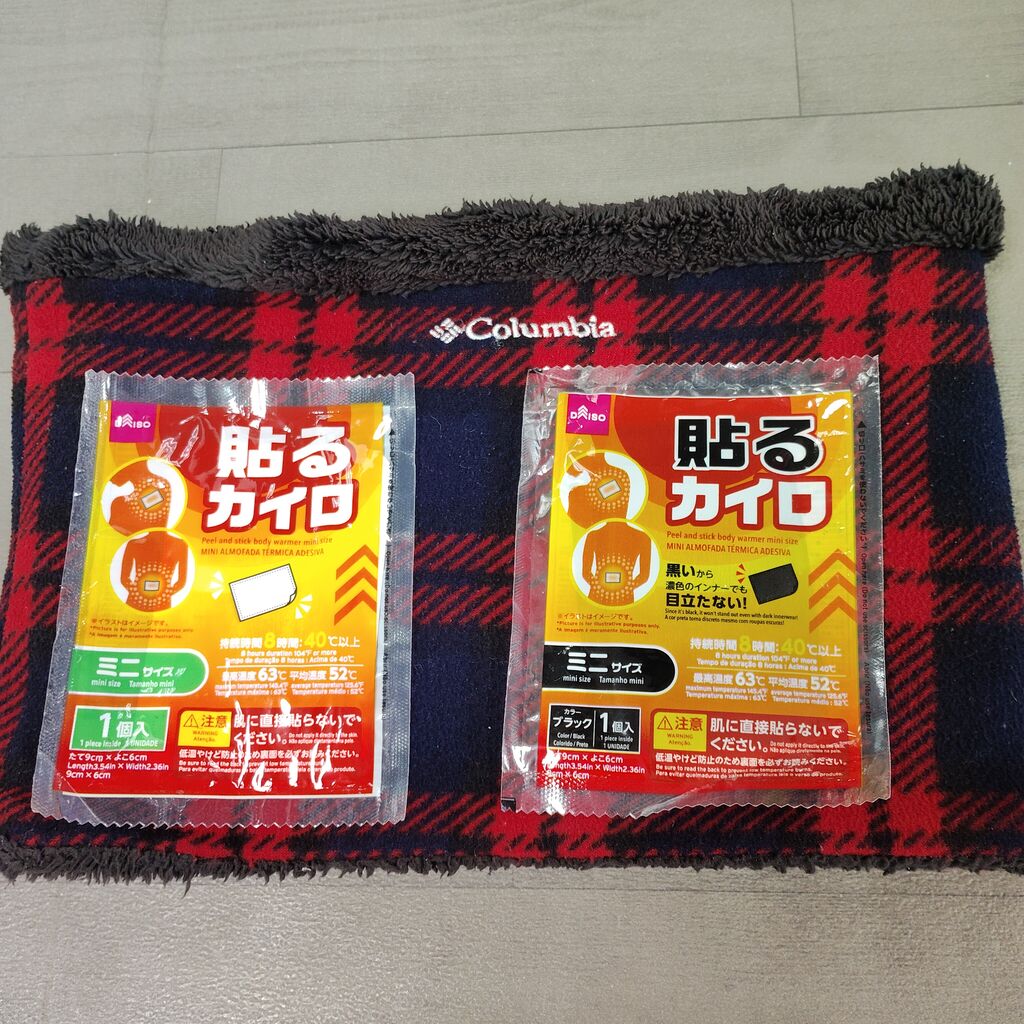 ネックウォーマーにカイロを貼り付けてます。
